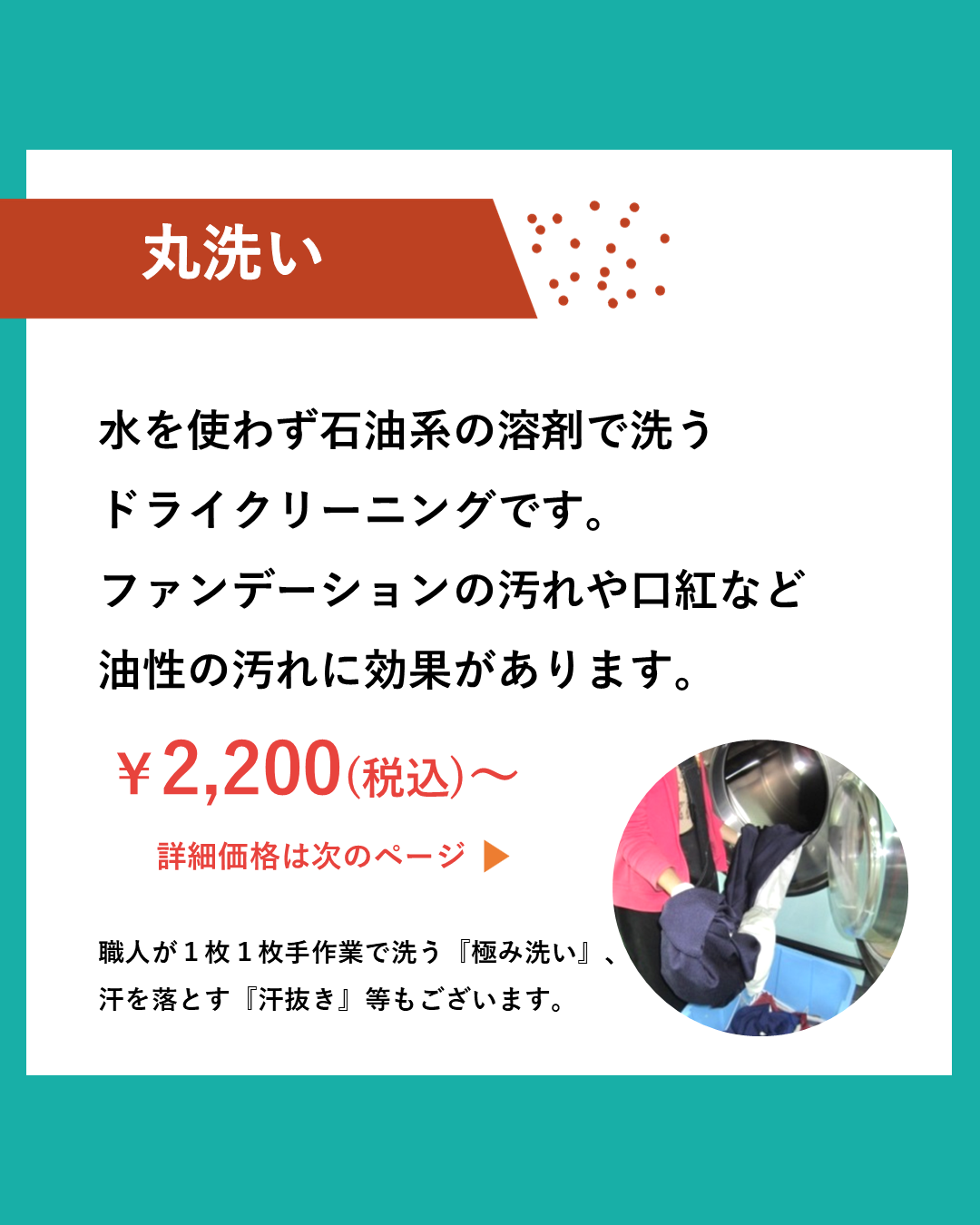 事前に予洗いを行い、蒸留式のドライクリーニングをします。